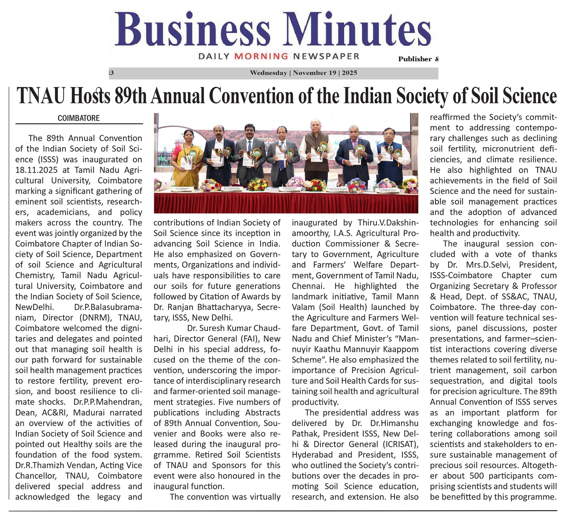 The Indian Society of Soil Science (ISSS) came into existence on December 22, 1934 in Calcutta under Act XXI of 1860 (Registration No. 8164/252 of 1934-35) with 28 members. It was formally inaugurated on January 3, 1935 at the Presidency College, Calcutta. Sir Bryce C. Burt, the then Agricultural Commissioner in the Imperial (now Indian) Council of Agricultural Research, was the first President of the Society and Prof. J.N. Mukherjee its first secretary.